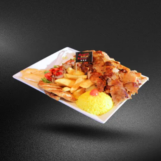 Gjiro pule, pilaf, sallatë mix, patate, salcë kosi, sos