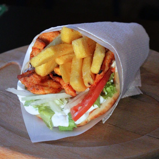 Fileto pule, patate, sallatë, qep, domate, salcë kosi